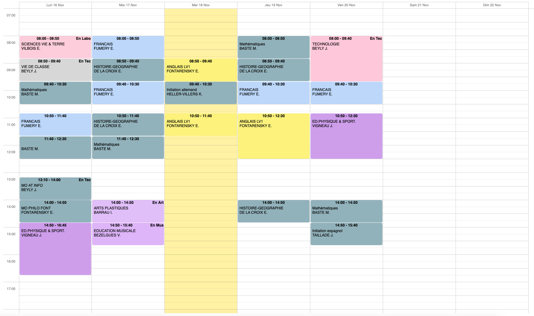 Les après-midi sont le plus souvent consacrées aux disciplines artistiques ou manuelles (arts plastique, éducation musicale) ou aux modules et ateliers.
